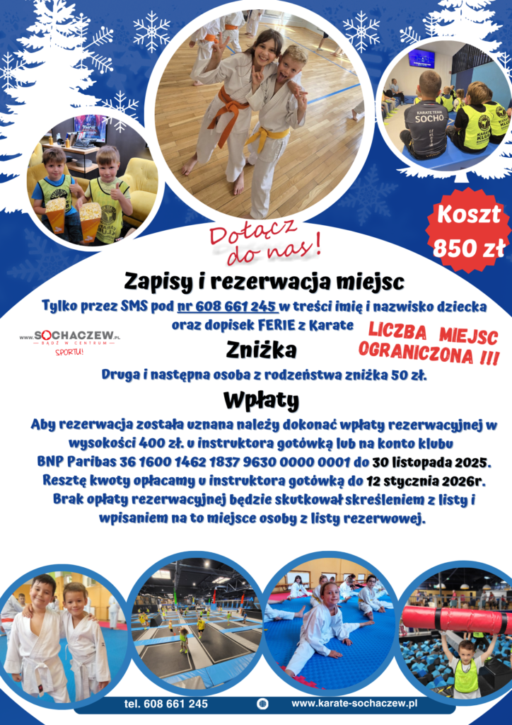 Zapisy SMS pod nr tel 608 661 245 – treści imię i nazwisko dziecka i dopisek Ferie z Karate