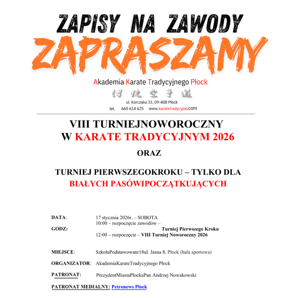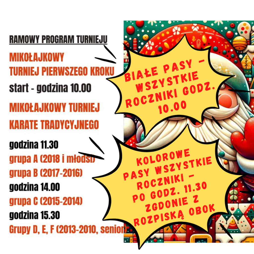Przedstawiamy ramowy program niedzielnego turnieju mikołajkowego. Przypominamy, że w turnieju pierwszego kroku startują dzieci początkujące, które jeszcze nie znają kata. W turnieju głównym biorą udział kolorowe pasy. Dla pewności sprawdźcie listy startowe w Turniej Generator. QR Kod jest w poście poniżej. Podane godziny są założonymi godzinami rozpoczęcia startów w poszczególnych grupach. Dekoracje medalistów będą odbywały się po zakończeniu startów w poszczególnych grupach. Do zobaczenia w niedzielę, 7 grudnia w Hali MOSu w Pruszkowie, przy ul. Gomulinskiego 4.